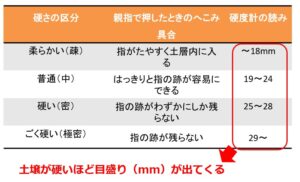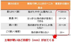 土壌が硬くなると、水はけが悪くなったり、作物の根が生えにくくなり、収量や味覚が落ち商品価値が低下する傾向があります。このため計器が無い場合は土壌面を親指で押して硬さを判定していました。